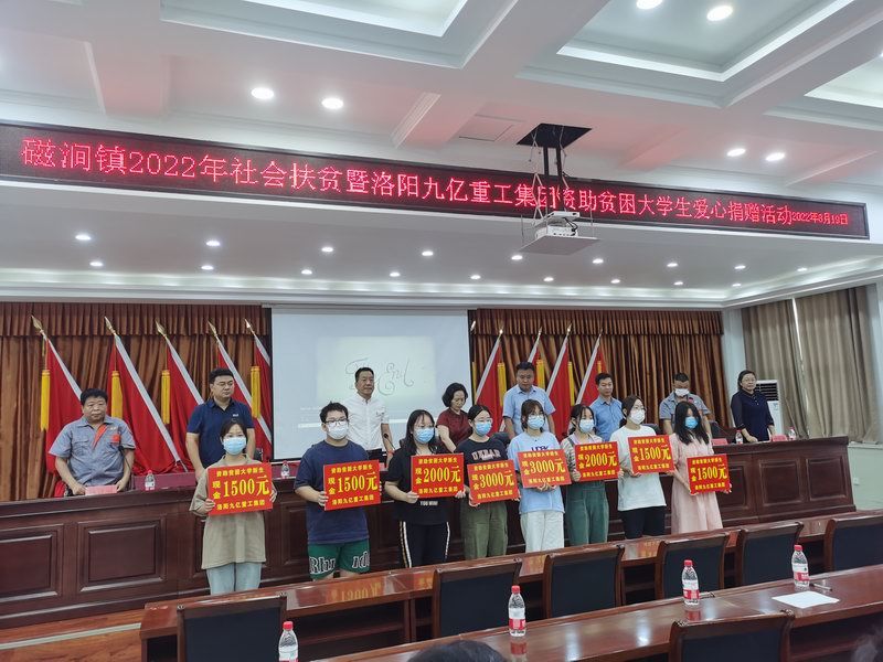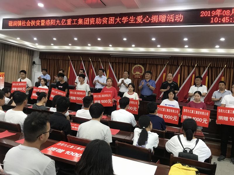 爱是与生俱来的,在血液里流动,在骨子里结晶,它源源不断的由心而生,永不枯竭,只要人人都愿意奉献一点爱,就如甘霖沐浴大地,人间处处盛开幸福之花! 为响应洛阳市政府精准扶贫政策,洛阳九亿重工集团有限公司及董事长王九茂积极参与捐资助学的慈善义举活动,特做出如下决定:1、公司帮扶磁涧镇2017年新招贫困大学生21名顺利入学,每人资助2000元,总计肆万贰仟元整; 2、总经理王九茂(县政协委员)以个人名义资助磁涧镇南窑村2017年新招大学生6名,总计12000元整; 我相信,在社会各界的大力支持和共同努力下,我们的“爱心助学”活动将会惠及到更多的同学,为了梦想,刻苦读书、报销祖国,广大同学也一定会在温暖的社会大家庭里茁壮成长,必将成为国家建设的有用之才! 洛阳九亿重工集团有限公司 董事长:王九茂